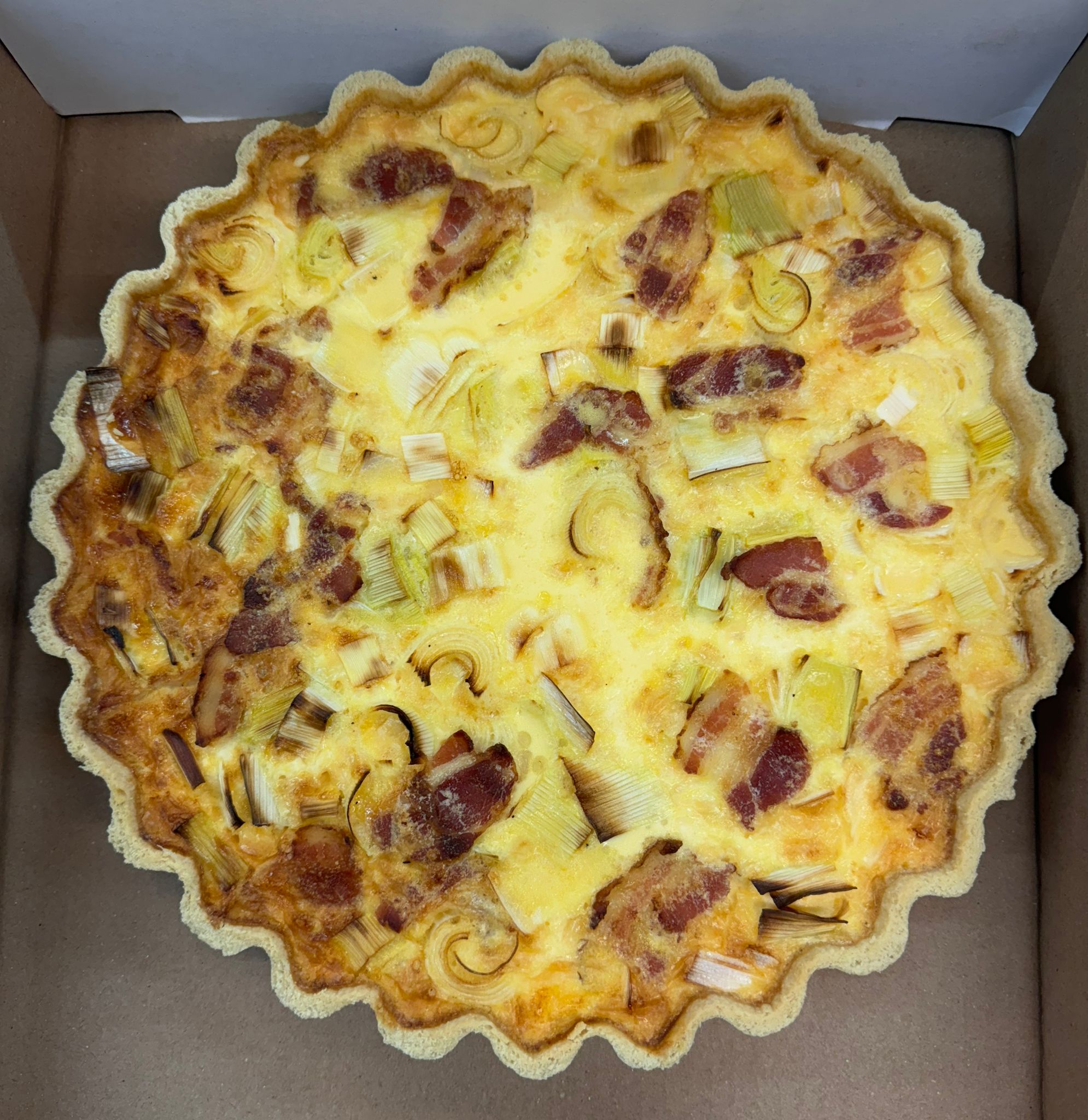 Pastry ( WHEAT flour ( calcium carbonate , iron niacin , thiamin ) , raising agents ( calcium phosphate , sodium bicarbonate ) ) , margarine ( vegetable oils , water , salt ( 2% ) , emulsifier ( E475 ) , colours ( E160 , E160b ) , cheese 20% ( MILK ) , MILK , EGGS , leek 10% , smoked bacon 5% , salt . pepper .