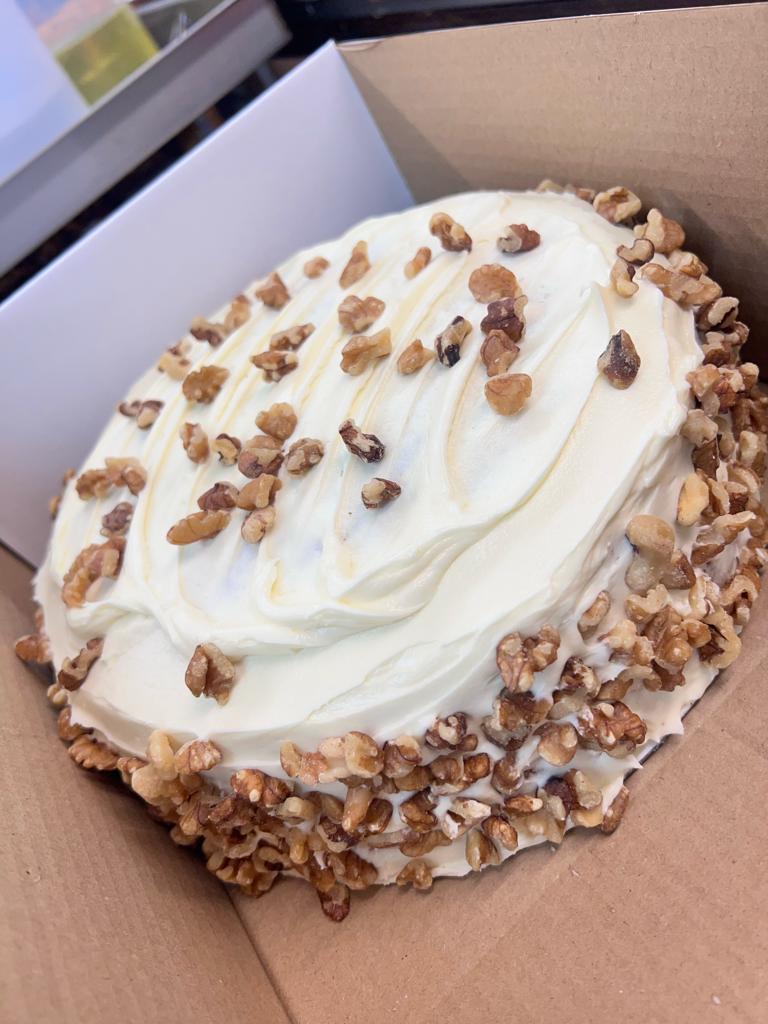 Sugar , WHEAT , flour ( Calcium carbonate , iron , niacin , thiamin ) raising agents ( Potassium Bicarbonate , Calcium Acid Pyrophosphate , sodium bicarbonate , Monocalcium Phosphate ) EGG , vegetable oil , Carrots ( 6% ) , Margarine ( vegetable oils , water , salt ( 2% ) , Emulsifier ( E457 ) colours ( E160 , E160b ) , Butter ( MILK ) , Cream Cheese ( MILK , Citrus Fibre ) , Icing sugar ( maize starch , refined sugar cane ) , WALNUTS ( 8% ) , Spices ( Ground Cassia ) , Desiccated Coconut , Salt , Preservative ( Potassium sorbate ) ,
