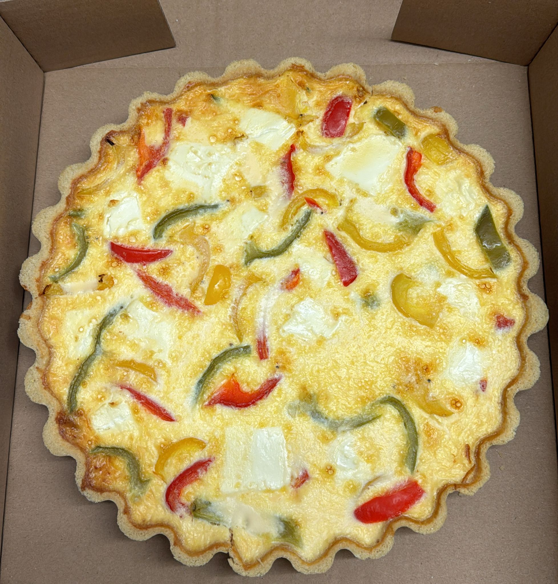 Pastry ( WHEAT flour ( calcium carbonate , iron niacin , thiamin ) , raising agents ( calcium phosphate , sodium bicarbonate ) ) , margarine ( vegetable oils , water , salt ( 2% ) , emulsifier ( E475 ) , colours ( E160 , E160b ) , cheese 20% ( MILK ) , MILK , EGGS , Goats cheese 10% , mixed peppers ( green pepper , red pepper , yellow pepper ) salt , pepper .
