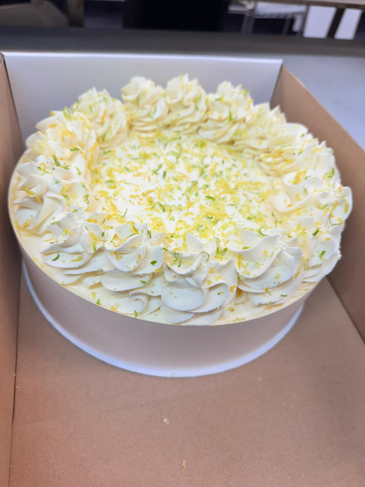 Fresh Cream ( MILK ) , powder cream stabiliser ( glucose , sugar , low fat CURD CHEESE powder , ( low fat curd cheese equivalent 89 . 1% ) , gelatine , starch , natural flavouring ( contains MILK ) , acid ( citric acid ) , salt ) , water , Biscuit crumb ( WHEAT Flour ( Statutory Additives : Calcium Carbonate , Iron , Thiamin , Nicotinamide ) , Sugar , Palm Oil , Invert Sugar Syrup , Rapeseed Oil , Raising Agent ( E500ii Sodium Bicarbonate ) , Salt ) ) , butter ( MILK ) , lemon jucie , lemon rind, Lime juice, Lime rind .