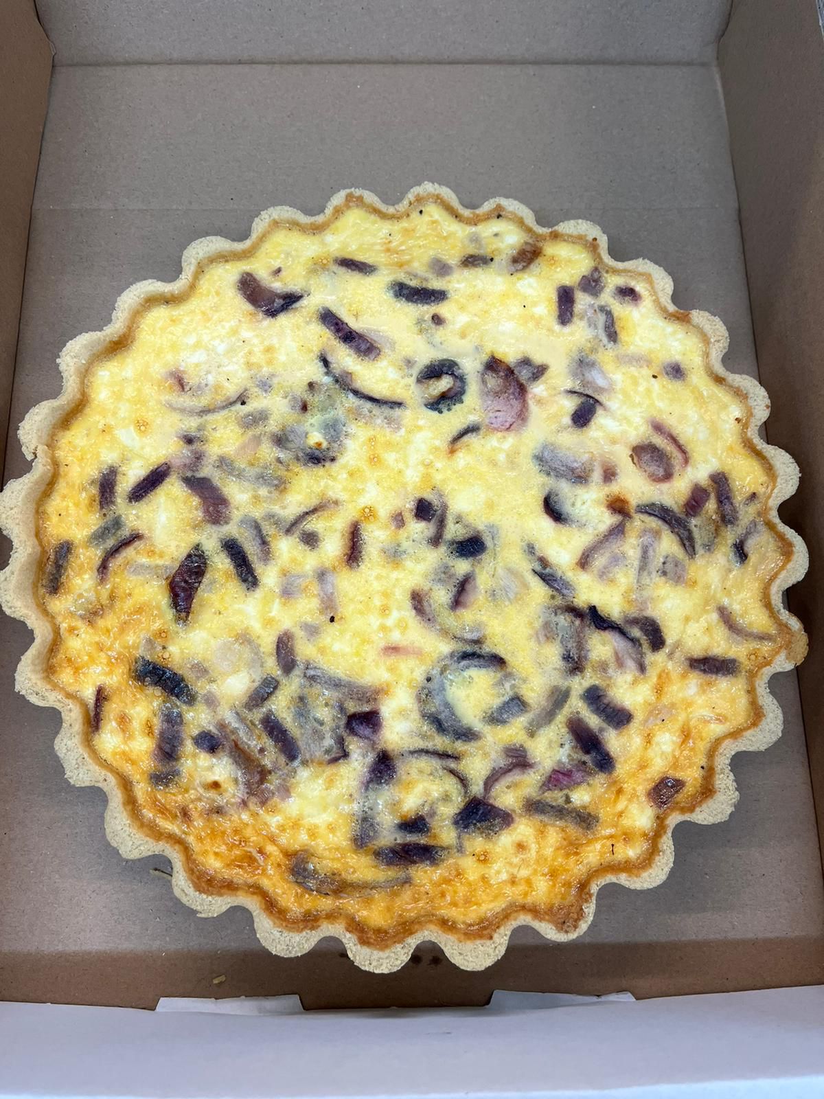 Pastry ( WHEAT flour ( calcium carbonate , iron niacin , thiamin ) , raising agents ( calcium phosphate , sodium bicarbonate ) ) , margarine ( vegetable oils , water , salt ( 2% ) , emulsifier ( E475 ) , colours ( E160 , E160b ) , cheese 15% ( MILK ) , MILK , EGGS , Red Onion 8% , Feta Cheese 6% ( MILK ) , salt , pepper .